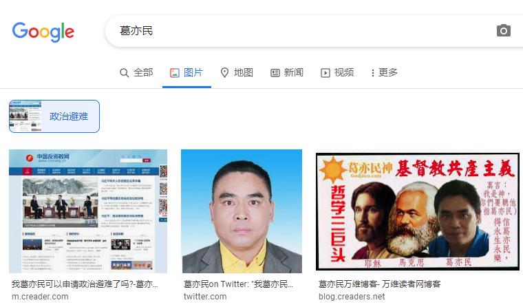 谷歌有意思,给葛亦民图片搜索搞了个专题“政治避难”
